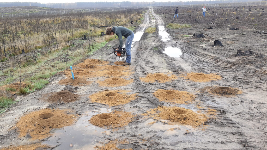 Säen: Etwa die Hälfte der Samen sind eingesetzt (Stieleiche, Roteiche, Feldahorn, Buche, usw.). Der kleine Waldsaum am oberen Ende muss ebenfalls noch gepflanzt werden.