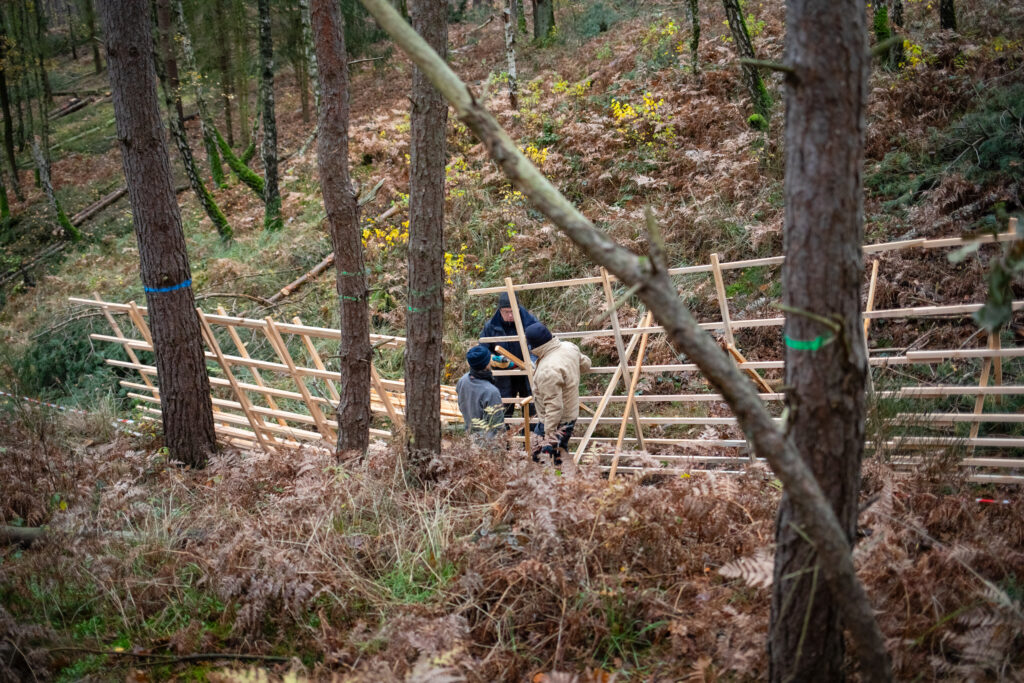 Auslichten: zur Vorbereitung wurden etwa 250 Bäume durch professionelle Baumpfleger gefällt, um ausreichend Licht in das Waldstück zu bringen.