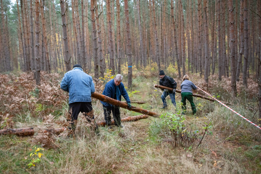 Sobald das Fällen und Rücken abgeschlossen ist, kommt die Zeit des Zaunbaus. Die Helfer bekommen eine Wegbeschreibung. Die Wege und Abzweigungen sind auch mit Flatterband markiert.