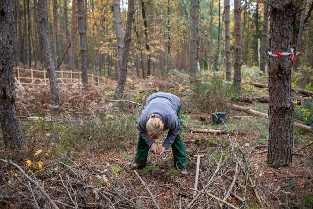 Wir arbeiten auf dieser Fläche zum ersten Mal mit dem NeuWald-Wildzaun, der Wildverbiss verhindert und so einen geschützten Raum für die darin befindlichen Pflanzen und Kleintiere bietet. Der Zaun ist ausschließlich aus Holz und Naturfasern gebaut. Er wird sich nach 15 bis 20 Jahren durch Verrotten selbst entsorgen: Der Mensch zieht sich zurück – die Natur kann sich aus eigener Kraft weiter entfalten. Einer der wichtigsten ersten Schritte ist die Abstimmung mit dem zuständigen Revierförster. Keiner kennt die forstwirtschaftlichen Bedingungen, aber auch die Befindlichkeiten und Gewohnheitsrechte der Waldbesitzer besser als er. Der Wald ist recht typisch für Brandenburger Forste, die meist als Monokultur-Plantagen angelegt sind.