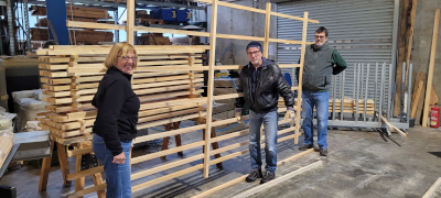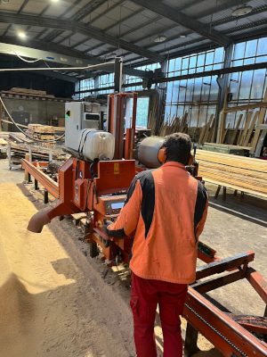 Die Maße der Bauteile wurden nun vereinheitlicht und so an die Erfordernisse einer industriellen Fertigung in einem Sägewerk angepasst. Dann kam der Moment, an dem wir mit einem kleinen Team einen ersten Probelauf machen konnten.