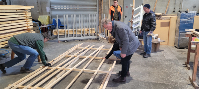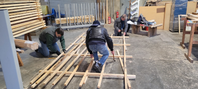 Wir konnten eine Fertigungshalle nutzen und stellten Prototypen her, indem wir die einzelnen Latten und Träger mit Holzdübeln verbanden.